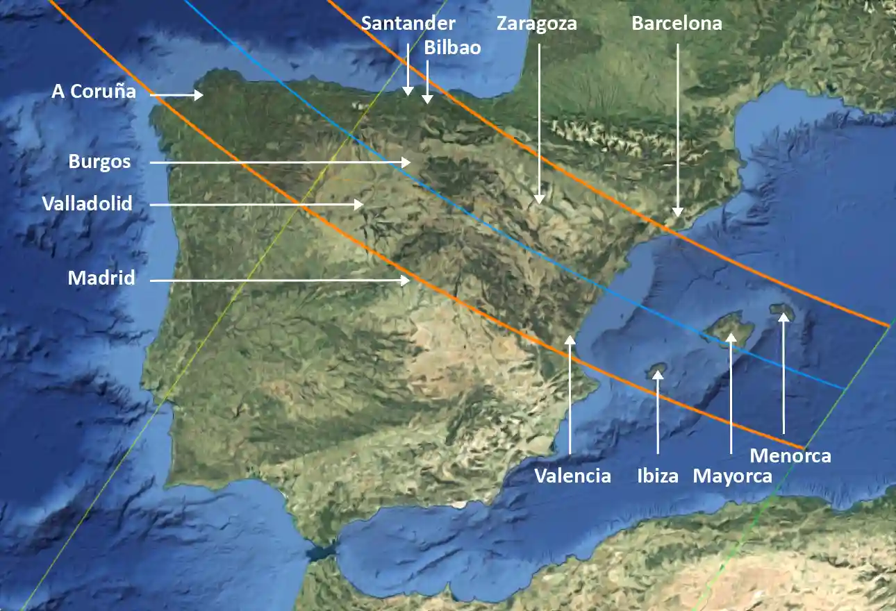 La trayectoria de totalidad en España cruza desde A Coruña hasta Valencia y Palma de Mallorca, atravesando ciudades clave como Oviedo, León, Burgos, Zaragoza y Santander